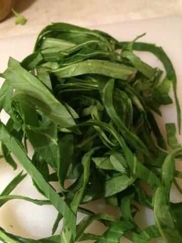 Después de que se han quitado las hojas, hacerlas rodar en una forma cilíndrica y chop. Se trata de una manera fácil de triturar las hojas.