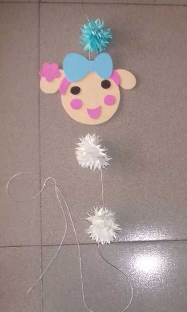 Paso 7: Tome una cadena. Pegue unos pompones de tela y cabeza de Miss La Sen en la cadena.
