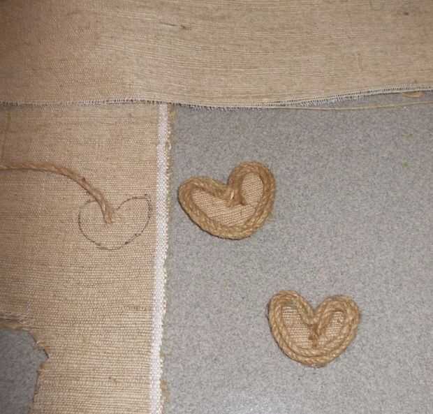 Paso 10: Dibuja la flor, forma del corazón en la tela de arpillera, la cuerda de cáñamo alrededor del pegamento y recorto.