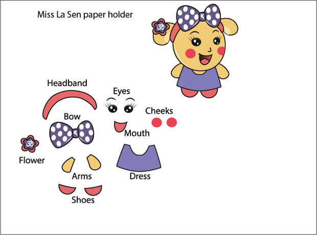 Hacer un soporte papel Miss La Sen es muy simple.Paso 1: Descargar este patrón y lo imprima en papel A3.Paso 2: Puedes imprimir o dibujar en la cartulina. Cortar, doblar y pegar los elementos.Paso 3: hecho. Se puede utilizar como el sostenedor de la