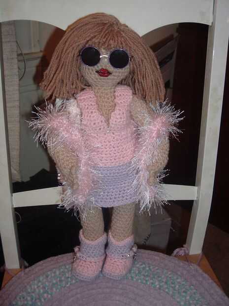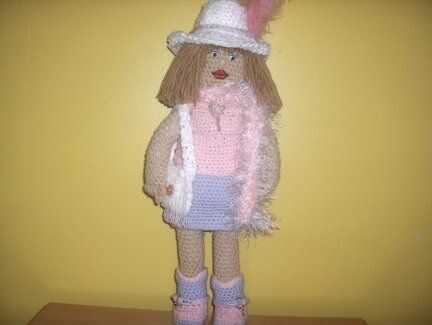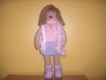 El cuerpo tuvo que buscar bronceada, así que utilicé un hilo marrón claro. La muñeca tenía que llevar un top rosa de corte bajo, lavanda mini falda, botas vaqueras y un sombrero de vaquero. Como se puede ver, utilicé hilo en esos colores para hacer su traje. Ella quería también que llevar un bolso con flecos de cuentas. Hice la bolsa con hilo de color rosa pálido y utiliza un botón decorativo como el corchete. He añadido la boa rosa luz que hice con diversión hilo de piel como una pieza agregada.