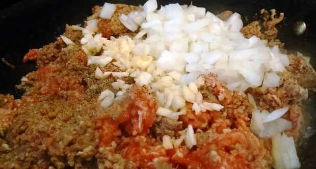 Preparar todas las verduras antes de comenzar cualquier cosa! Comience a cocinar el arroz. Ahora poner toda la carne picada en una sartén grande y comenzar a cocinar a través de. Rociar con aceite de oliva y Agregue ajo, cebolla y todas las especias (la cantidad de especias es a gusto). Comenzar a mezclar en la salsa de tomate. Sólo necesitará añadir unos 3/4 de la lata. Cúbralo y déjelo a fuego lento hasta su uso.