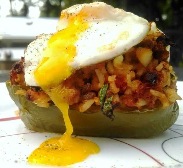 Quitar cocidos pimientos del horno y decorar con un huevo fácil, sal y pimienta.