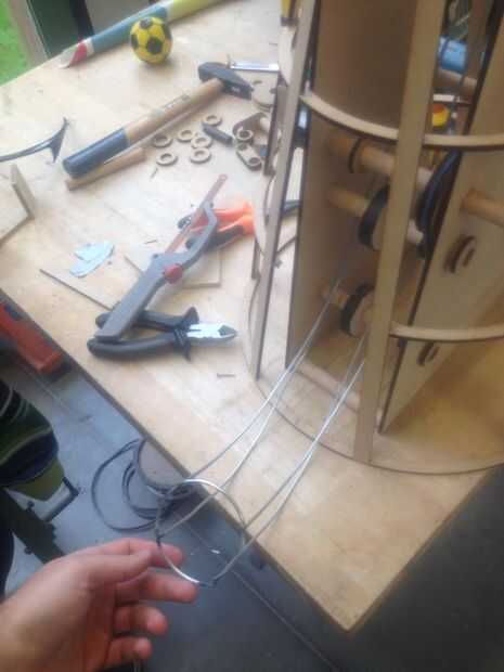 Los rieles que hicimos de 4 cables de acero gruesos. En un extremo hemos soldado un anillo de acero un poco más grande que las bolas que íbamos a utilizar. Si usted no puede soldar, sólo puede anudar los cables en el anillo de acero. Asegúrese de que sus nudos no se en el camino de las bolas de tiros!
