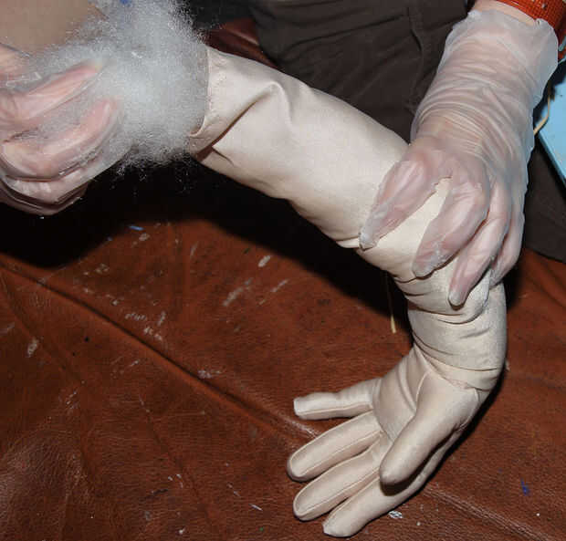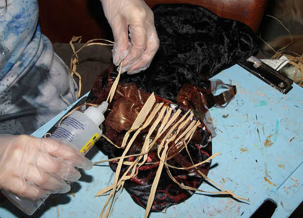 Comenzamos con un pecho muscular. Cortar tiras de flecos de la cebra de tiraje y cosido en los brazos del pecho, para hacer bandas de brazo. Tenemos rellenos los hombros y los brazos del pecho con relleno, para que los brazos luzcan realistas. También rellena los guantes color nude, teniendo cuidado de que los dedos parezca real, por lo que los hace más ancho en la parte inferior y más delgada en la parte superior y fijadas a los extremos de los brazos. Para la túnica del cráneo, hemos alterado la parte inferior, corte en un borde dentado. Hemos pegado la paja tira por tira en el escote y las mangas de la túnica. También nos empató en cráneos de plástico pequeñas aquí y allá sobre la túnica. Para la falda, abierta de la falda de pasto cortado y había pegado alrededor de la cintura de la falda impresión animal, para que envuelto alrededor de él.