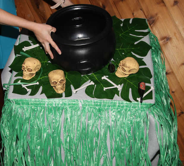 Una vez que se organizó la "mesa", hemos querido decorar así que parecía como de selva, un lugar un hechicero podría crear experimentos y pociones mal. Cubrimos el fieltro en la parte superior de la mesa con hojas de color verde, que nos pega en el. También nos pega en cráneos, usando espuma ligera que sería pesado de llevar, así como huesos de plástico. Hemos añadido colores botellas de burbujas de jabón, a ver como las pociones y los ingredientes un hechicero pueden utilizar.