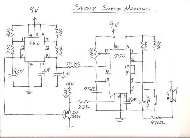 Se trata de un trabajo esquemático para la máquina de sonido espeluznante. Ha sido triple comprobado errores;] Haga clic en el [i] en la esquina superior para ver la imagen sin los rectángulos amarillos.