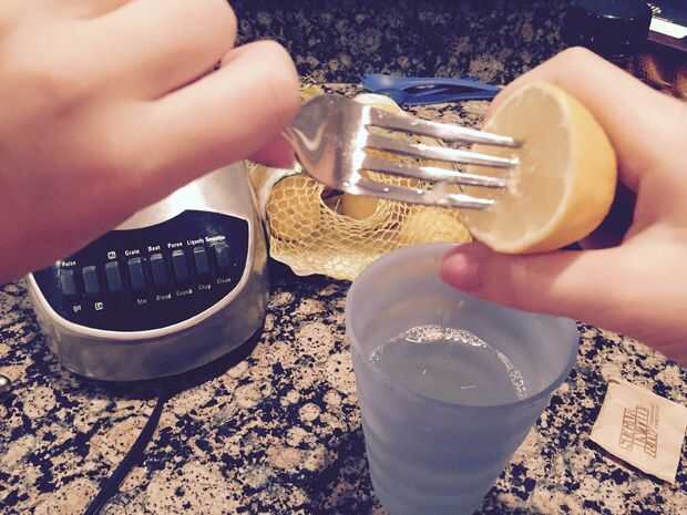 Llenar la Copa la mitad con agua. Meter un tenedor en la mitad del limón y exprimir y giro. Repita en la otra mitad del limón.