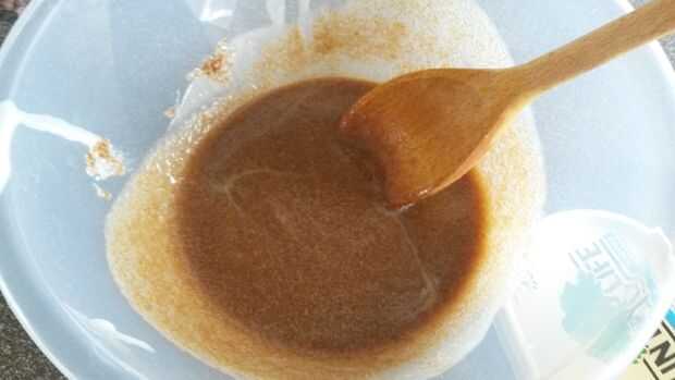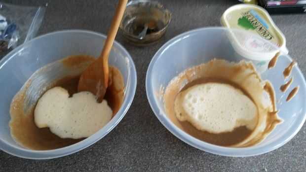 Agregar el azúcar morena y azúcar y revuelva hasta combinar. Dividir esta mezcla a la mitad en dos tazones de fuente. En un tazón agregar la mitad de la mantequilla fundida y la otra mitad de la mantequilla en el otro recipiente.