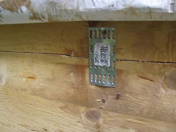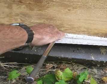Clavo de la madera contrachapada a la solera. Usé un clavo de la varilla en tubo conductor para clavar clavos inmediatamente adyacente a los revestimientos metálicos, que tendían a resorte en su posición.