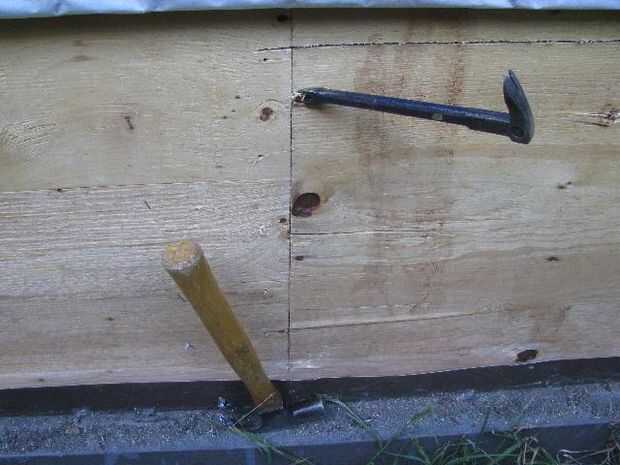 Una vez que se corta la hoja de madera contrachapada, utilice el extractor de clavos y martillo para quitar todos los clavos de sujeción. Retire la sección de corte, exponiendo la solera.