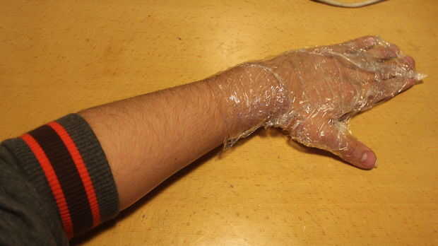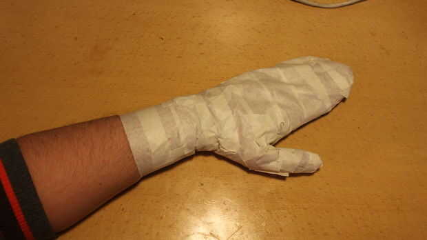 Luego Envuelva el área con cinta de enmascarar, asegúrese de hacer como unos pliegues en la cinta como sea posible. Trate de usar tiras de cinta que no son excesivamente largas ya que es la principal causa para tener que plegar la cinta. Envuelva la cinta alrededor de bien como usted puede tener unos minutos y usted no quiere cortar la circulación sanguínea, suavemente enrolle la cinta alrededor de la zona.