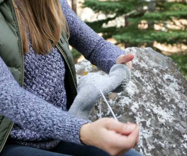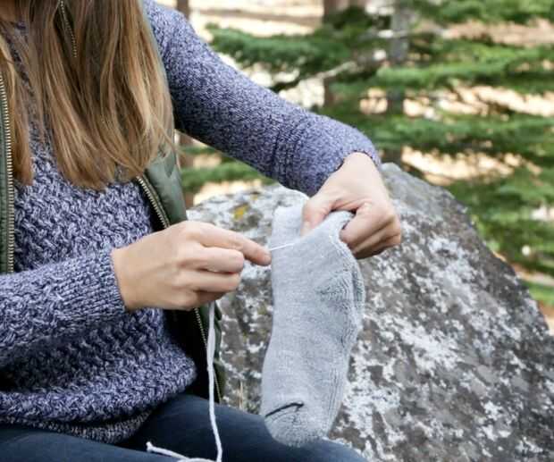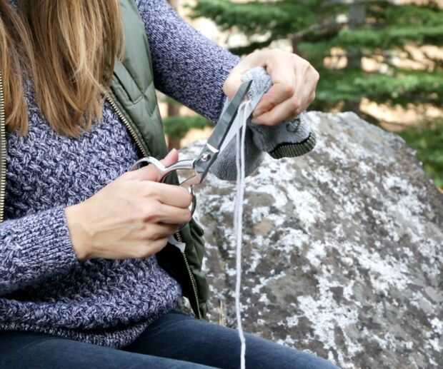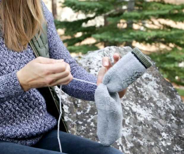 Tomando el hilo de rosca aguja de zurcir, coser un simple y coser todo el calcetín a la altura marcada por el dedo pulgar, asegurándose de dejar una cola de 5-6" en el principio de sus puntadas.