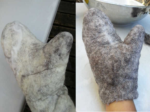 Puesto que usted está trabajando en un par de mitones, repita todos los pasos para la segunda. Siempre puede iniciar la segunda manopla en cualquier momento y terminar de fieltrar ambos guantes a la vez. Una cosa fresca sobre formar fieltro es que mantendrá la forma que da así en el caso de guantes, puede dar forma a cada uno así que terminas con una manopla de la mano izquierda y un guante de mano derecha.