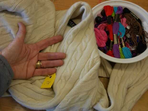 1. tienda de segunda mano (100% lana) suéter... ¡ Tuvo suerte y encontró un suéter de la cachemira, con un genial punto de cable de 75 centavos de dólar!
