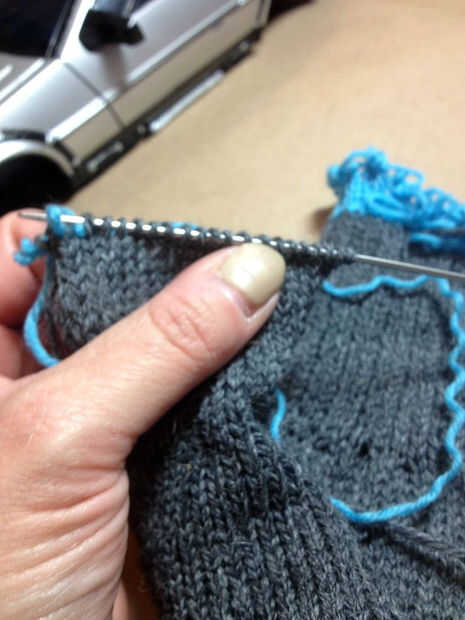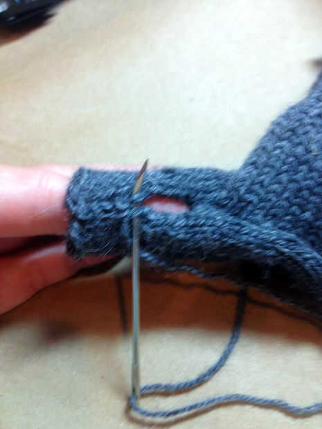 Quitar residuos de hilados de pulgar. Recoger vivo proyecto puntadas de hilo con una aguja de tejer. Se unen de todas las puntadas con la cola de hilo y cose por el lado del pulgar usando una puntada del azote.