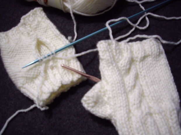 una amiga envió un par de medias de la rodilla y me preguntó uso a hacer un par de guantes sin dedos. La imagen que envió de su visión mostró un pulgar pedazo (a diferencia de un agujero del pulgar), así que me senté a averiguar cómo hacer para crear