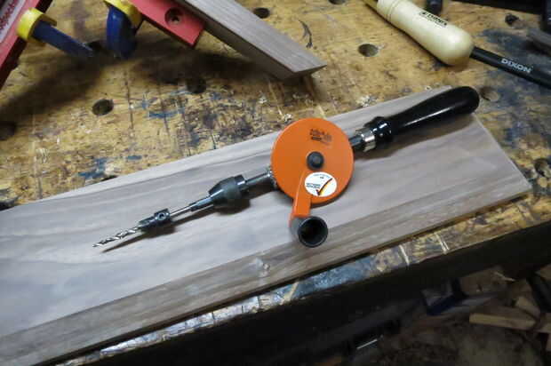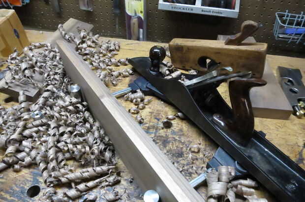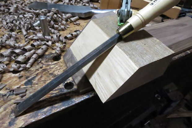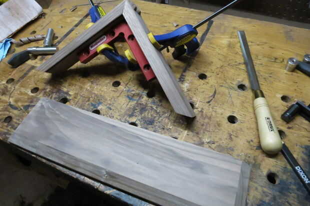 En los extremos, me sujeta mi bloque de 45 grados en su lugar y utiliza un cincel de pelado a corta distancia el material restante. Va de 1/8" en un momento fue bastante bueno como se puede ver en el video. Terminé de cepillar tres bordes todos con mi restaurada #7 Stanley.