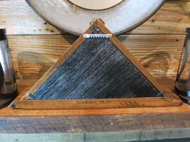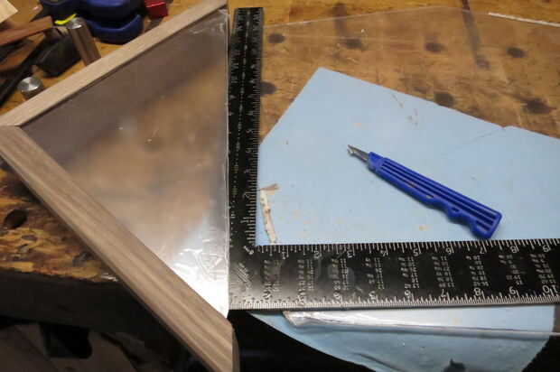 Una vez que el triángulo esté seco, quite las abrazaderas y prueba de ajuste de una pieza de plexiglás. Utilice un cuchillo o un cortador dedicada a cortar para que quepa. Inserte el vidrio y dry-fit las piezas. Después del montaje, medir y cortar la madera contrachapada para la parte de atrás. Perfore agujeros pequeños a lo largo de la parte posterior para permitir la inserción de los botones de giro y una percha.