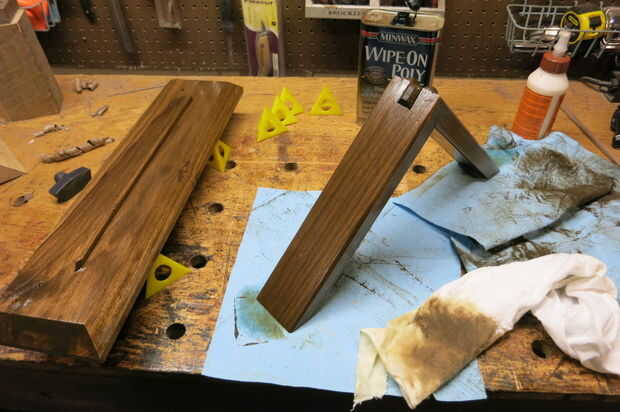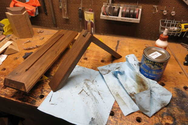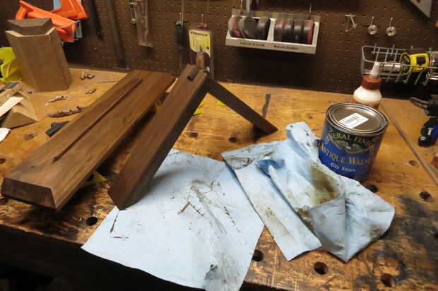 Recta final! Lije las piezas según sea necesario para eliminar cualquier resto y todo lo mancha quieras. Fui con nogal oscuro que tiende a ser popular antes de continuar con algún brillo limpie en poliuretano. Puse en ~ 5 capas, lijar ligeramente la superficie con 600 x papel de lija o lana de acero 0000 # entre cada uno. Usar pintura de aerosol negra en la parte posterior de la madera contrachapada.