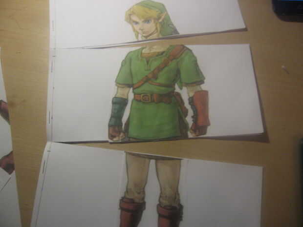 Si va a imprimir y cortar, imprimir un carácter para cada página que tienes. Dividirlas en tercios (no necesariamente es iguales!) entre la cabeza, el torso y las piernas. Usted necesitará a lo largo de las directrices que usted dibujó en el paso 4. El jefe de la primera chracter en la parte superior de la primera página, su torso en el medio y sus patas se pegan en la parte inferior. Para el segundo chracter, pega su cabeza en la hoja superior de la página segunda, torso en medio, etc. Cortado la punta de las botas de Link, que está bien, pero cortando pedacitos principales no se ve bien.