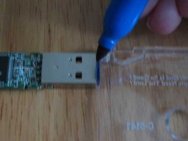 Ahora tenemos que marcar nuestra carcasa de cassettes donde queremos que el USB se deslice hacia fuera. Coloque su dispositivo USB contra la mitad de la cubierta de cassette (ver foto) en la parte superior y hacer una marca que es sólo ligeramente más largo que el ancho del palo. Coloque la cubierta nuevamente Junta y hacer una comparación marcan la otra mitad.