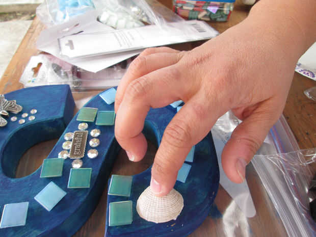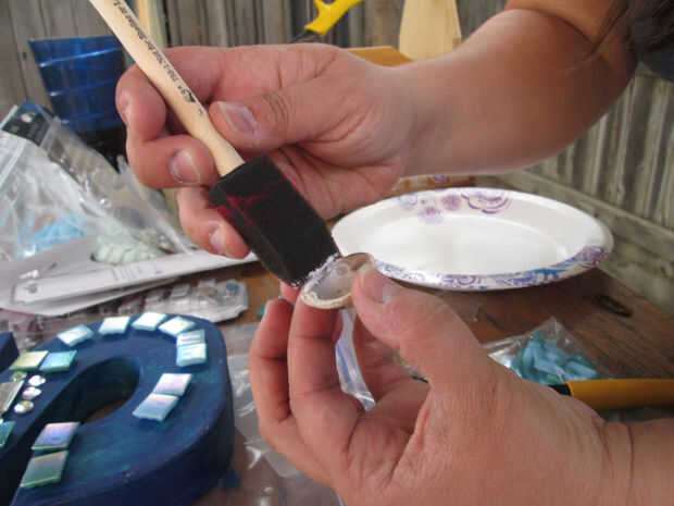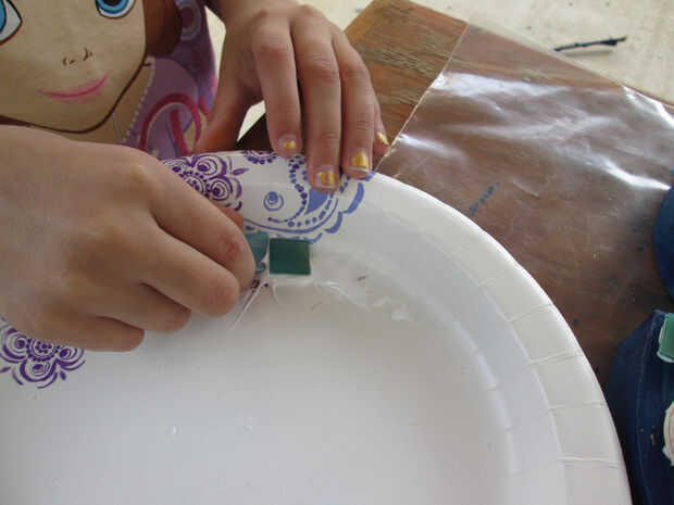 Utilicé un pincel para colocar el pegamento en las piezas, pero terminé usando mi dedo en el extremo a dab pegamento a la parte inferior de las baldosas. Mi hija con la ayuda de las inicialmente colocar el pegamento en la teja sumergiéndola en una gota de pegamento coloqué en un plato de papel. Sólo lo hice ella podía sentir como ella estaba ayudando a.