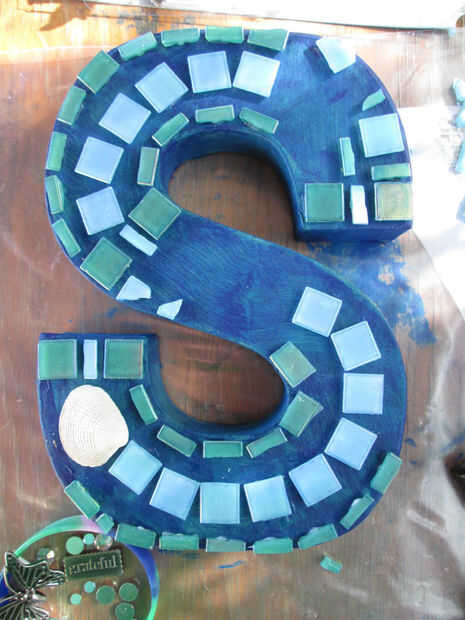 Como se puede ver en la primera foto, pegué la cáscara primero. Como la mayoría de los azulejos fue alineado con la ubicación de la cáscara en la parte inferior de la mitad de la letra "S", he pegado primero la cáscara y había todo lo demás alrededor de él había trabajado. Elegí la cáscara para que eso él se establecería en la lechada de cola en lugar de pegar a la parte superior de la lechada debido a su profundidad. Si hubiera sido unos proyectiles más pequeños, habría pegado a la parte superior de la lechada.