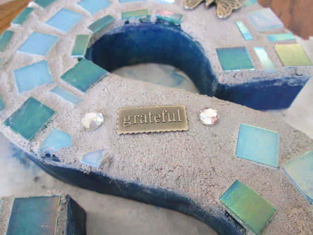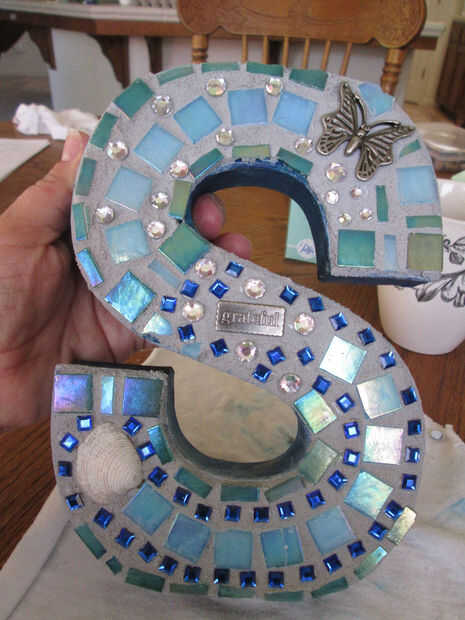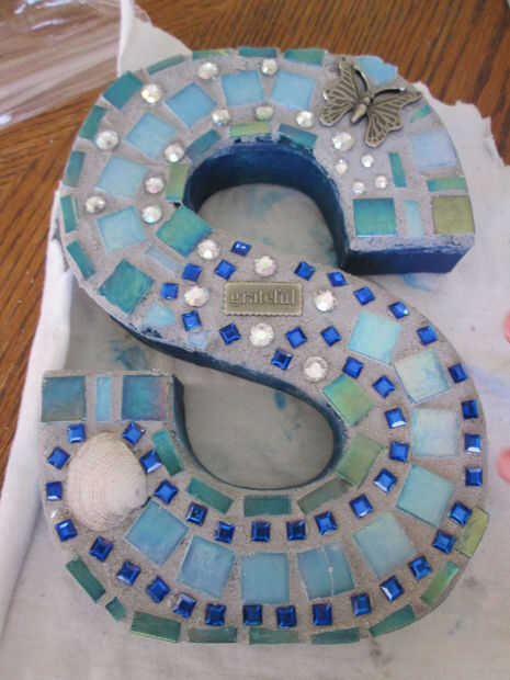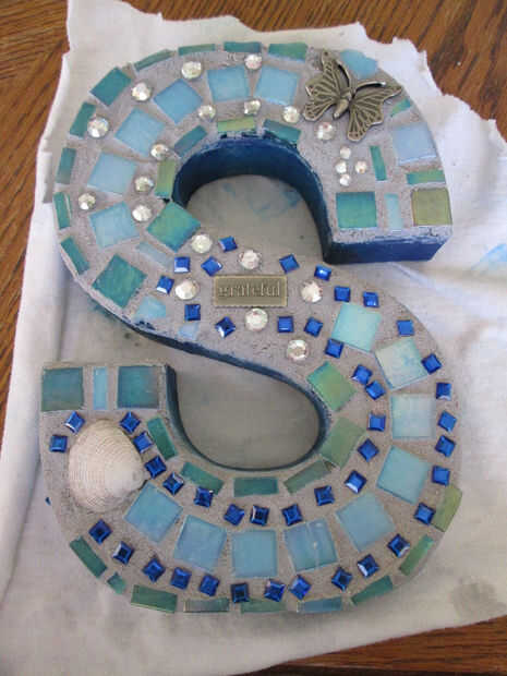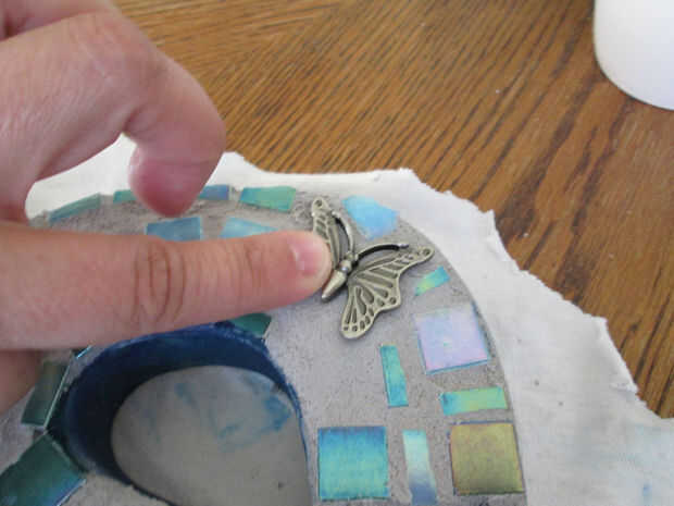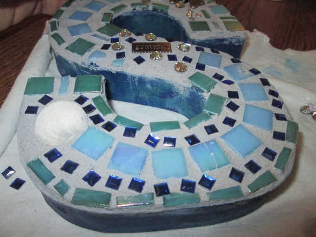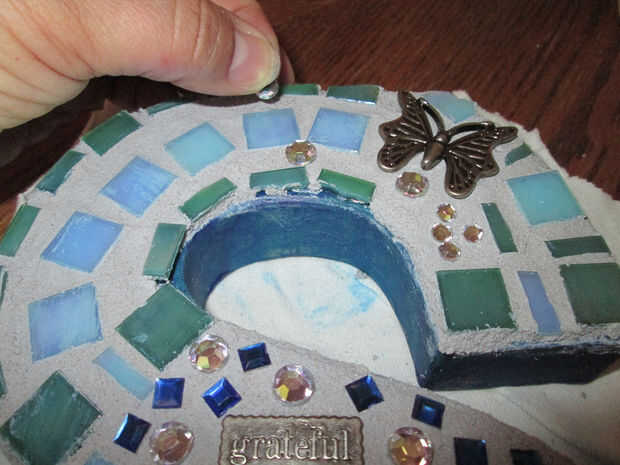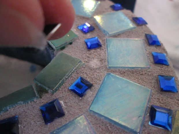 Consejo: Muchas piezas de mosaico pueden conseguir una mirada brillante mediante el uso de aceite de naranja (o limón) (el tipo que se utiliza para madera de brillo). que no recomendamos usar aceite si vas a colocar adornos directamente sobre el cemento. Para un proyecto que utiliza el pegamento en la lechada, o esperar hasta que el pegamento se seca después de que los adornos se colocan o no utilizan aceite en absoluto. El brillo de los diamantes se destaca lo suficiente en la pieza acabada.