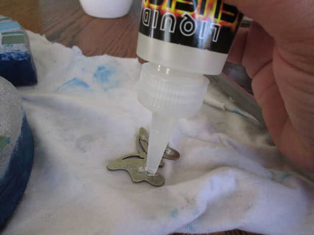 Utilice el pegamento de uretano claro directamente sobre la parte posterior del adorno que está poniendo sobre la lechada.