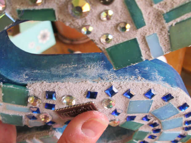 Después de unos 30 minutos de dejar la gemas y diamantes de imitación de seco en la cara de la pieza de arte, me entregó la pieza y retocado de la pintura en la espalda y todos los lados que tenía manchas de lechada a él. Dejé la pintura secar durante aproximadamente una hora antes de aplicar el dispositivo de suspensión.