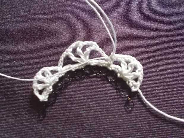 Fila 2: Hacer dos puntadas de cadena, seguidos de una puntada doble bucle a través de la media puntada solo en el segundo bucle de la cadena de cable (contando desde la derecha). Hacer dos puntadas de cadena más y una doble puntada bucle aunque la misma puntada solo como antes. Hacer dos puntadas cadena más otra vez y la misma puntada doble con la misma posición. (Espere) dos puntos más de la cadena y luego una puntada de resbalón, insertar el gancho en la puntada solo de izquierda del tercer lazo de la cadena de cable (contando desde la derecha). Hacer puntadas de cadena tres y luego una puntada de agudos (nueva puntada alerta!), insertar la aguja en la media puntada solo del sexto círculo del cable (contando desde la derecha). Repetir este patrón hasta que haya completado tres puntos agudos total. Luego tres cadenas más puntadas y puntada de resbalón, insertar el gancho en la puntada solo de izquierda del octavo círculo del cable (contando desde la derecha). Hacer dos puntadas de cadena, seguidos de una puntada doble bucle a través de la media puntada solo en el décimo lazo de la cadena de cable (contando desde la derecha). Repetir este patrón hasta que haya completado tres puntadas dobles total. Dos cadena puntos y puntada de resbalón, insertar el gancho en la puntada de izquierda.