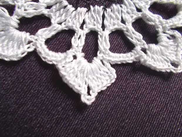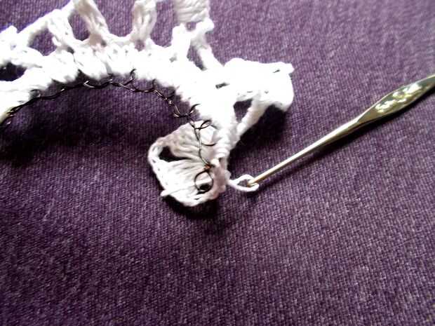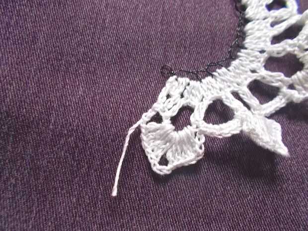 Escondió las colas, solo inserte el gancho en un agujero cercano en el lado y jale la cola a través de. Inserte enganche en otro cercano agujero y otra vez, tire la cola a través de. Repita hasta aproximadamente 0.5" de cola se oculta antes de cortar el hilo. Repita para el otro extremo.