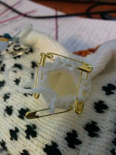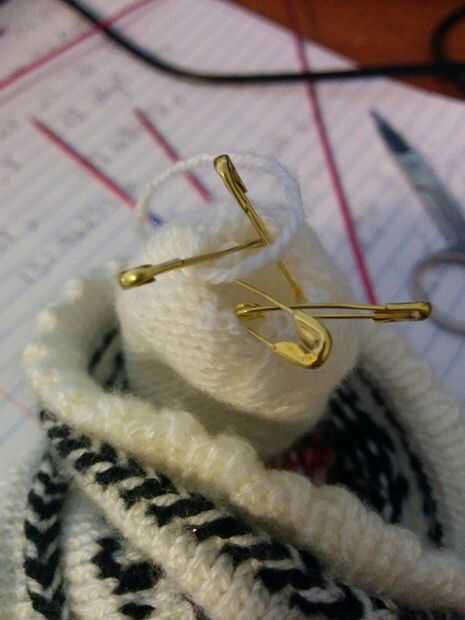 1: Coloque cada puntada en un perno de seguridad muy pequeño. Tire de los pasadores de seguridad a través de la parte superior de los dedos para que el dedo está dentro (el espectáculo de fotos esto se hace una fila anterior). Tire del extremo del hilo por cada puntada para terminar el dedo. Estire y tejer al final.