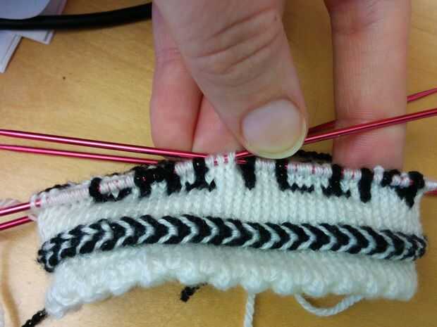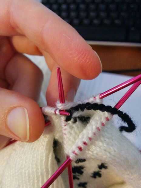 Algunas notas. Este es el primer lugar que estará trabajando con múltiples colores donde no alternan cada puntada. Si la distancia entre dos puntos del mismo color es 4 puntos o menos, usted no necesita preocuparse por ello, simplemente mantenga el hilo hacia atrás hasta que esté listo para tejer con él otra vez. Si la separación es más de 4 puntos, necesita los dos hilos juntos entre otra puntada para sujetar en posición para que no hay hilos sueltos largos dedos atrapar como pones el guante en la torcedura. Simplemente le de vueltas al medio con los dos colores de hilo, la continua que hace punto con el color que estaba trabajando.