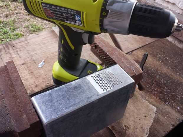 Redacté un patrón para la perforación que encajaría muy bien mi ventilador de 40mmX40mm. Puse un respiradero en la parte delantera izquierda (mirando el caso y suponiendo que las conexiones del panel sería posterior) y uno en la parte trasera de la derecha para conseguir la ventilación cruzada tanto como sea posible. Usé una broca rígido que me fue recomendada en el Home Depot de perforación de metales e hizo a través de todos los agujeros. Casi 200!
