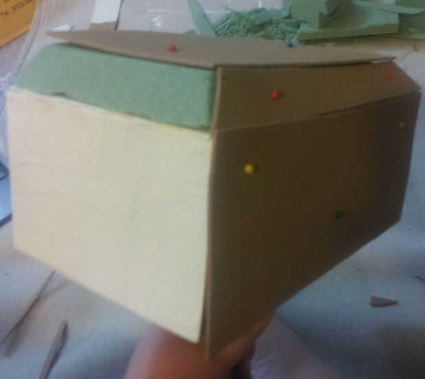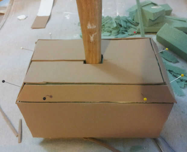 Que hacer, hacer lo mismo que hicimos antes: ocultar la espuma floral con espuma de artesanía. Los bordes inclinados no quieren quedarse, pero puede pin ellos abajo-meter el pin en sólo un poco, no hasta la cabeza - y retire los pasadores más adelante.