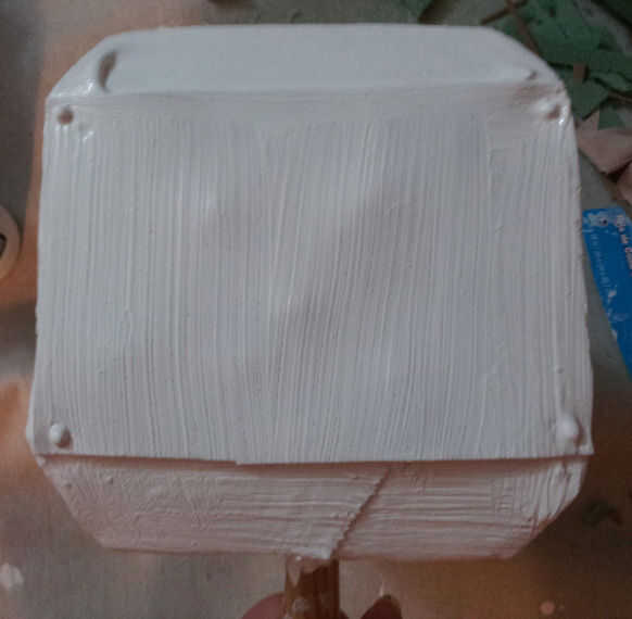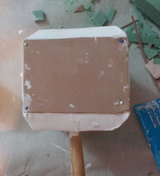 Ahora es el momento para el gesso. Esto es donde el rojo Solo tazas vienen en; Usaban para sostener el gesso y pintura, ya que la mía vino en una botella. Gesso no 's duro de trabajar con, aunque usted sólo será capaz de pintar un determinado número de lados a la vez. Cada capa toma 24 horas para secar, y necesita varias capas. La tela es sed, por lo que no tenga miedo de hacer sus abrigos gruesos. Tenga cuidado como se cepilla los dientes, porque la tela está bajo tensión y recordar a empuje un poco las grietas y hendiduras donde el cepillo no llega. No olvide que necesitará descansar esto en algo; Deja un lado sin pintar para que pueda descansar el martillo sobre algo plano. El gesso puede y se pega su martillo para su lona/periódico.