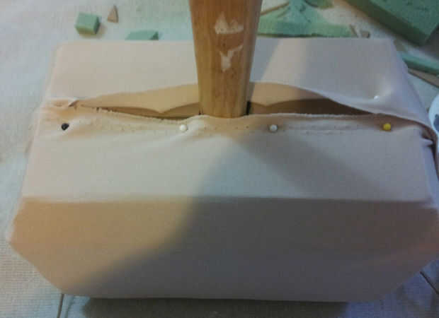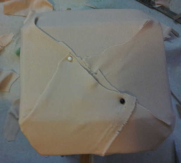 La idea básica es tomar a la tela y envolver la caja como un regalo. Asegúrese de mantener al tejido bajo tensión incluso. Por esta razón debe tener pernos de cabeza plana. Aprender de mi error. En algún momento que acaba de decidir que si hubiera tenido remaches en Asgard, habría utilizado, así que yo simplemente inmovilizados cosas. Usando el pegamento es una opción para un acabado más liso, pero realmente no tengo ninguna idea cómo funcionaría.