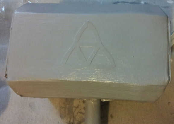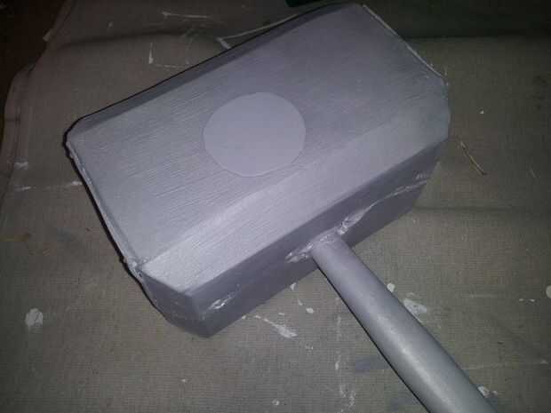 Mientras que está pintando, pintar todo el camino hasta el extremo de la manija. También no olvide recortar un círculo de espuma pequeño y la pintura por separado, recordando a los lados de la pintura. Cuando la capa final de pintura esté seca, pega el círculo en la parte superior del martillo.
