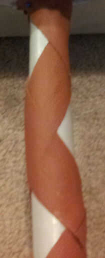 Todo lo hice, que yo lamentablemente no tengo fotos de, se cortó algunos piel marrón fina en dos tiras, aproximadamente 13/4" a través de. Me había fijado en la parte inferior del martillo y había pegado en un espiral hacia abajo del martillo, uno tras otro. Esto le da un patrón de celosía con diamantes grandes mostrando el mango-razón por la cual hemos pintado la manija en el primer lugar.