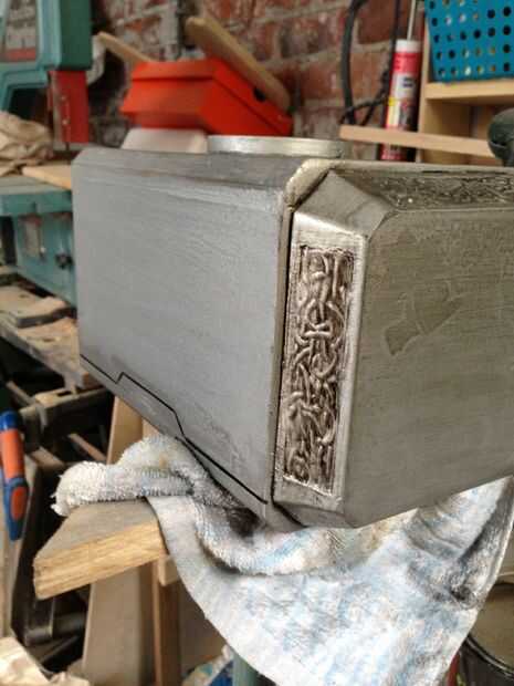 Después mis dedos hasta el hueso de lijando y pintando el martillo tanto sé ven pintura de plata en mi sueño, es la diversión del pedacito! Detalle! --Negro de pintura, 2 pinceles (uno bueno, uno a la pintura en la "palmadita") y un trapo para limpiar y difuminar,--que es llegar!