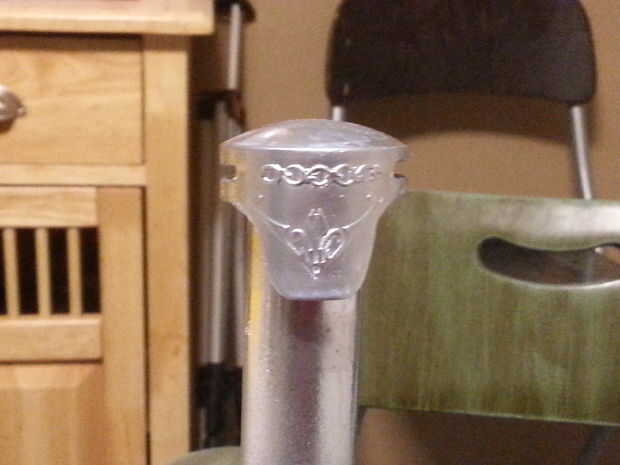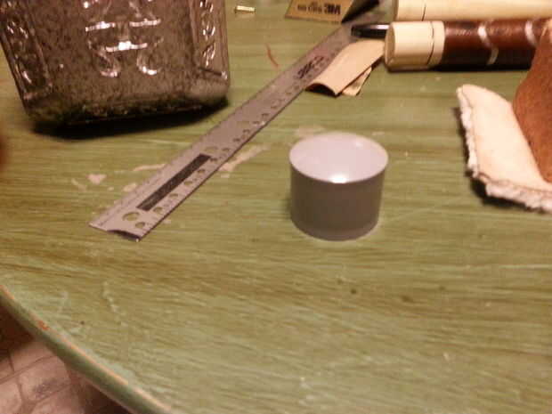 Usé un taco de madera de 1 1/4 de pulgada y más pintura en aerosol Krylon para hacer el mango. Utilicé una tapa de plástico que compré en Lowes y dremeled la forma del martillo de la película. Solicité unas pegatinas compré en Hobby Lobby y luego había pintado la tapa.