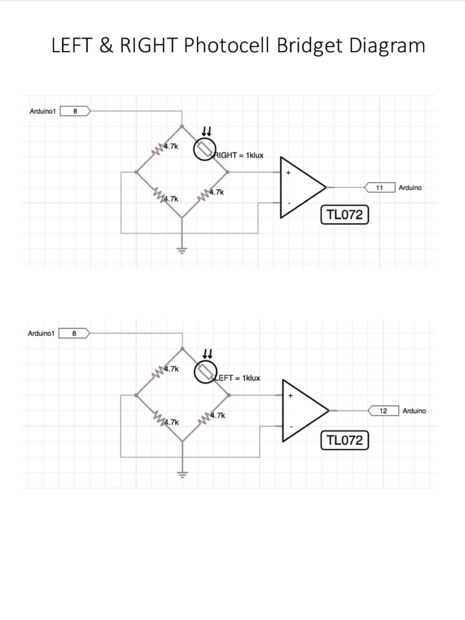 La base de la "reacción de la luz" son las fotocélulas. Las fotocélulas (que son resistencias que varían con la luz), se conecta en configuración "Whitestone Bridge." Un cambio en la intensidad de la luz causa un desequilibrio del puente resistivo, que llevó a la saturación de un amplificador operacional. Se utilizaron dos fotocélulas, uno delantero y uno trasero. La acción es simple cuando el robot se mueve hacia adelante y la luz se detiene, los motores de dan "marcha atrás". Y por supuesto, vicio y viceversa.