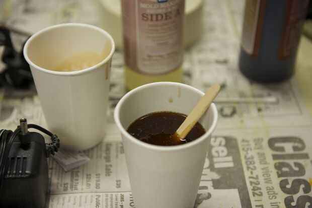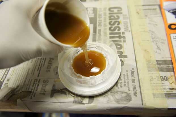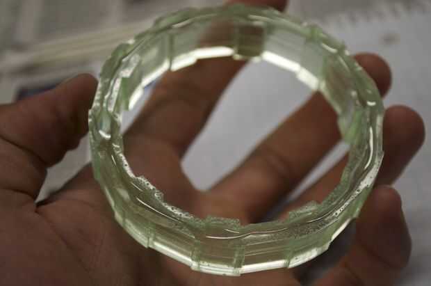 A continuación, preparar bastante transparente de epoxy en un contenedor transparente y aumentar lentamente el tinte azul y verde hasta el color mira bien (utiliza 2 gotas de verde y 1/2 gota de azul de 1/2 taza de epoxy). Verter esto en el molde y esperar a que se seque (otros 2 días). Cuando salte hacia fuera, usted debe tener una parte que es la misma forma que la pieza de acrílico que formuló, pero debe ser el color correcto!