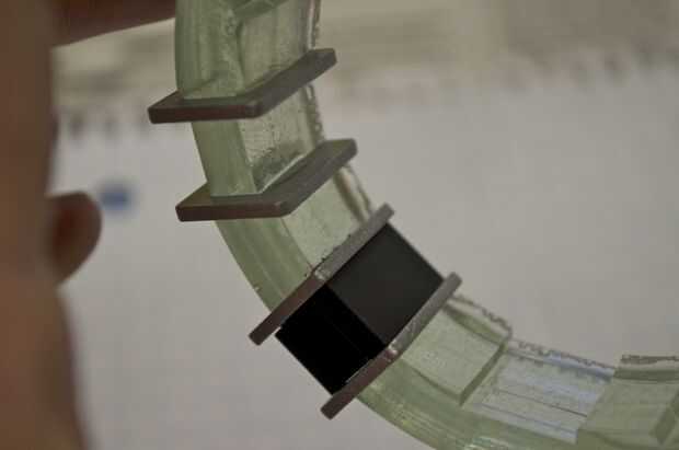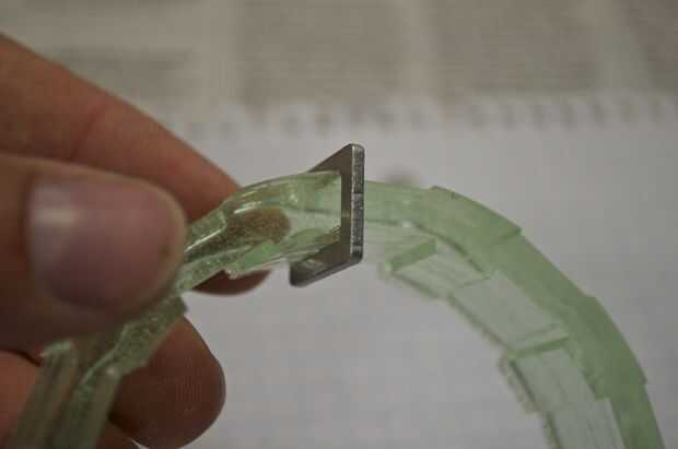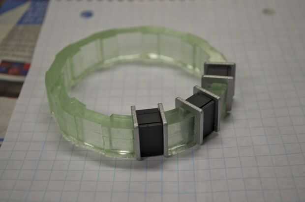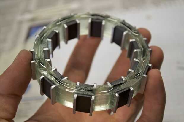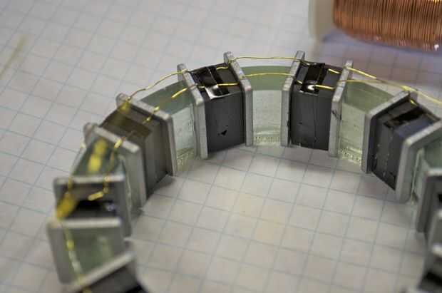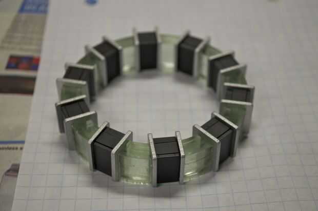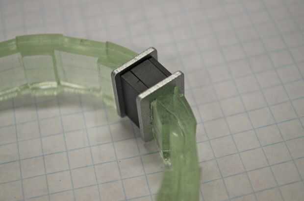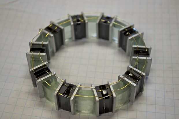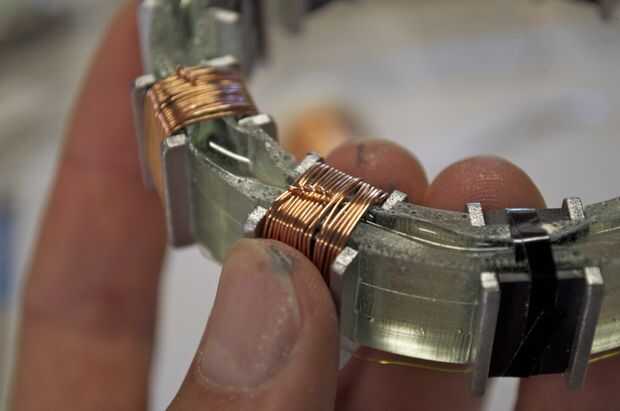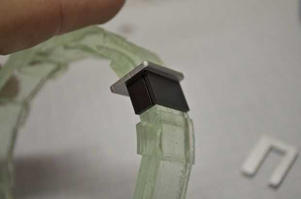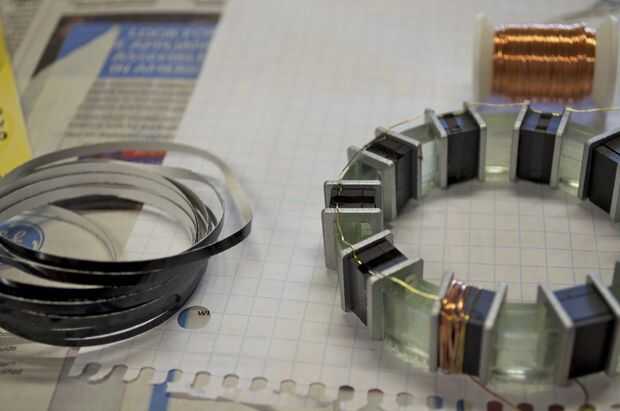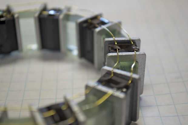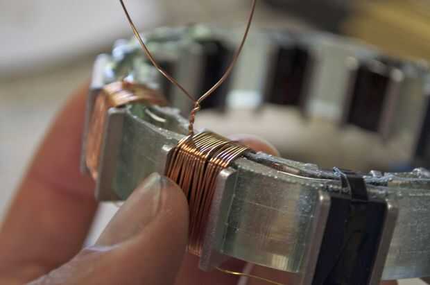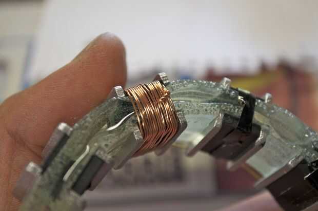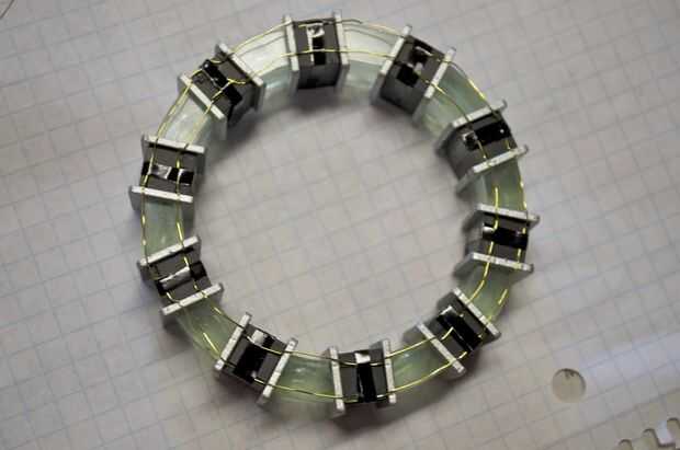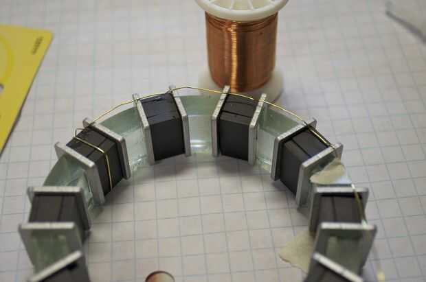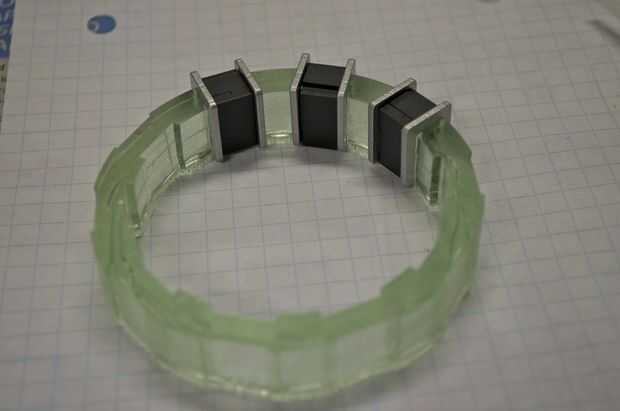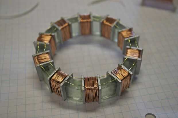 Ya que no quiero derretir a cualquiera de la pintura de las bobinas mag, sólo usé un poco de pegamento super para sujetar el anillo de bobina mag. Una vez que todos 10 bobinas de mag se pegan, me encontré dos trozos de alambre de oro alrededor de la circunferencia del anillo (ver fotos). Les até con cinta delgada raya diplomática para mantener temporalmente. Entonces envolvió cada bobina mag con alambre de cobre fino, envolviendo el alambre sobre el fino alambre de oro. En realidad, los alambres de oro se sueldan en forma individual, pero que tomaría mucho tiempo y los pacientes y puede también calentar el plástico demasiado, arruinando el trabajo de pintura. El método que utiliza crea un efecto muy similar por mucho menos trabajo. Si lo desea, incluso puede dab pegamento caliente donde los empalmes de la soldadura deben ser y luego pintar plata por lo que se ven como pequeñas piscinas de soldadura.