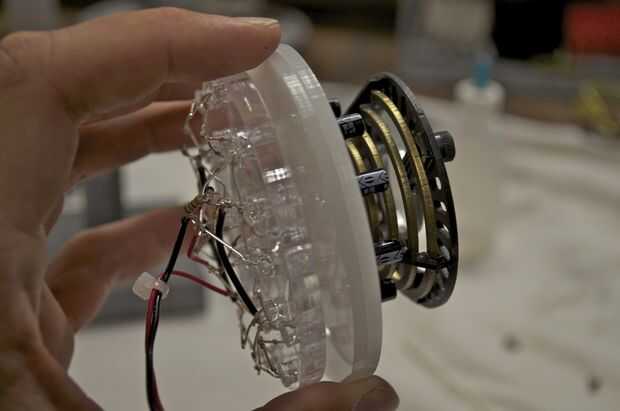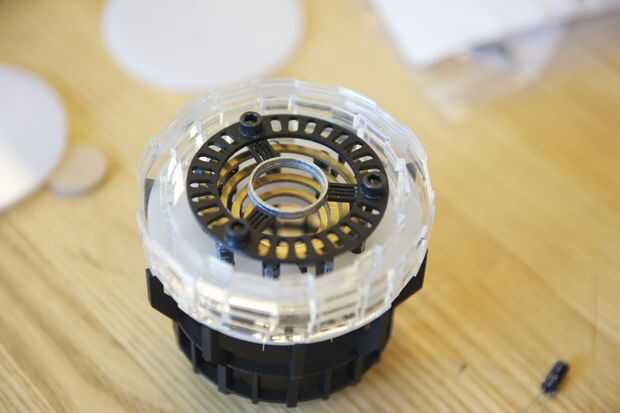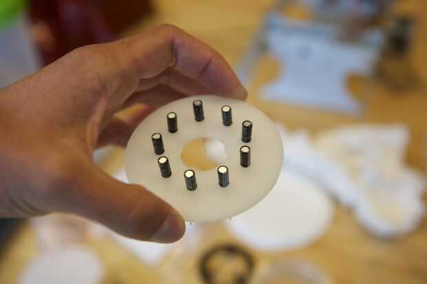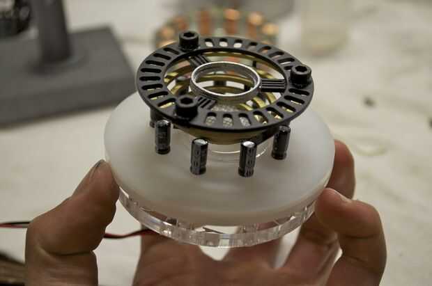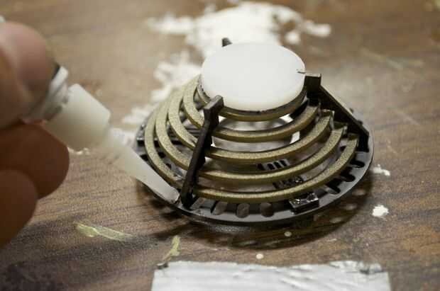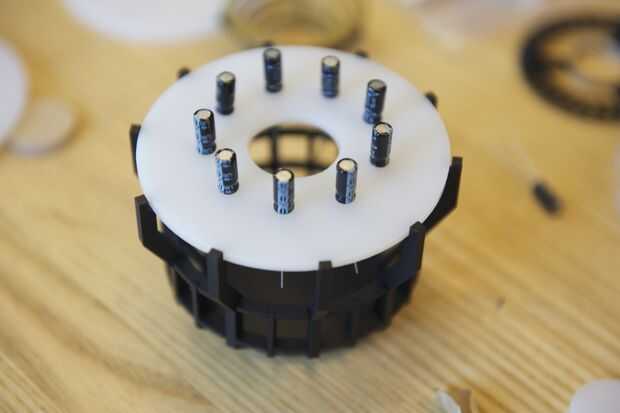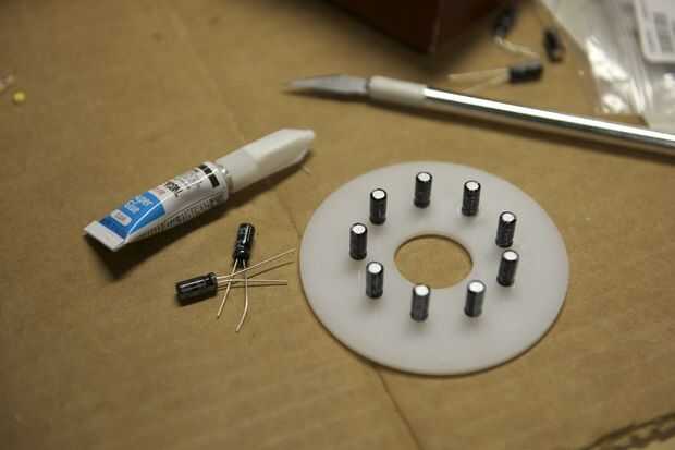 A continuación pegué en 9 pequeños condensadores negro en el difusor con pegamento. Creo que eran 10 μF.