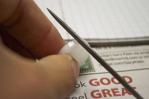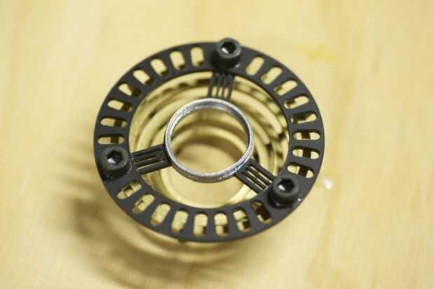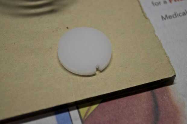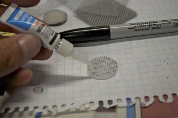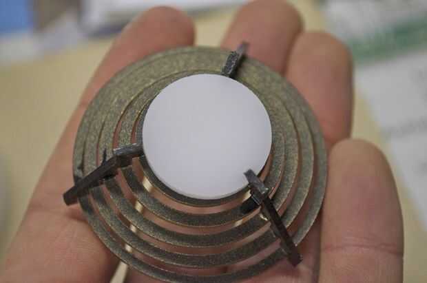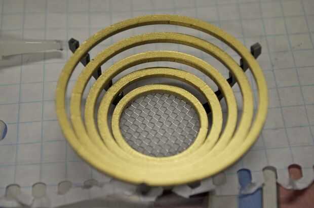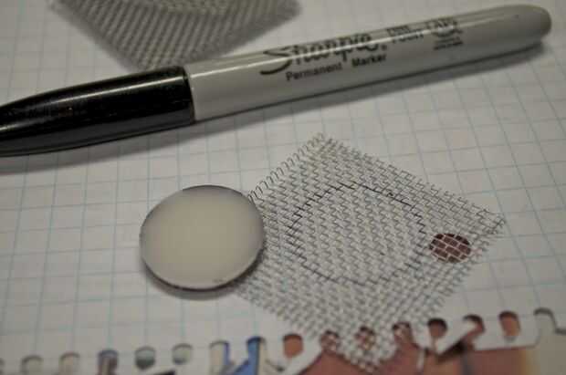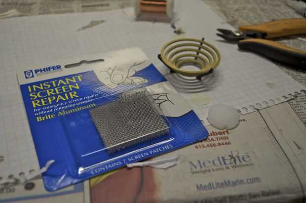 Compró un pequeño trozo de material de malla de metal de puerta de pantalla y cortar un círculo pequeño de ella, entonces esta había pegado hasta el pequeño disco de acrílico blanco translúcido que se ajusta en el centro del difusor. Tomó un poco de trabajo con un archivo para conseguirlo para caber debajo de la más pequeña de anillos concéntricos.