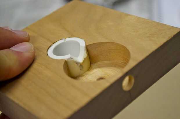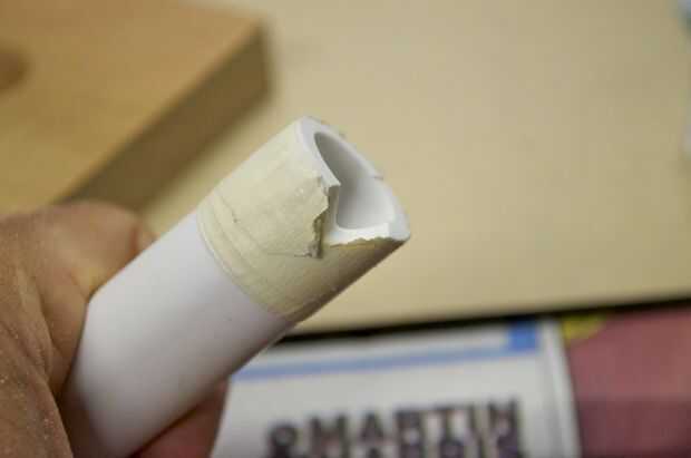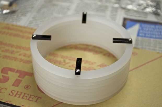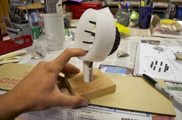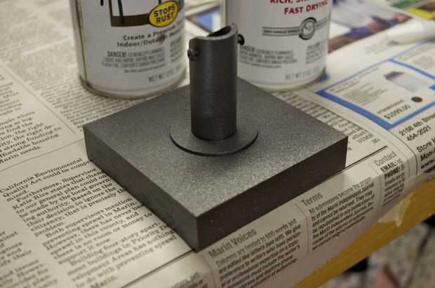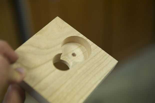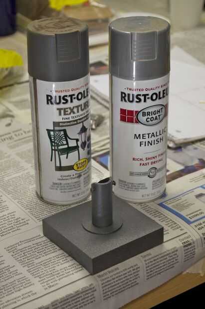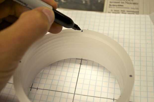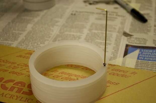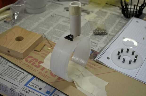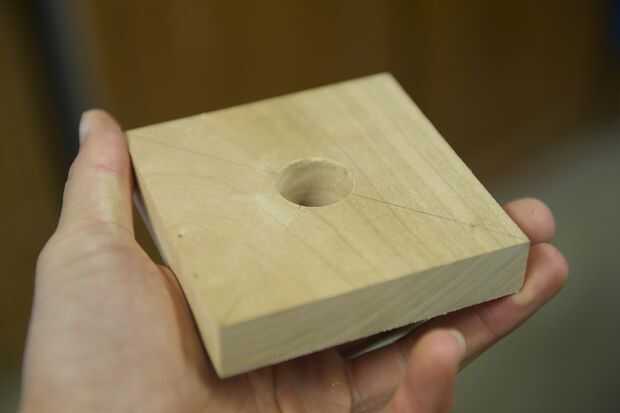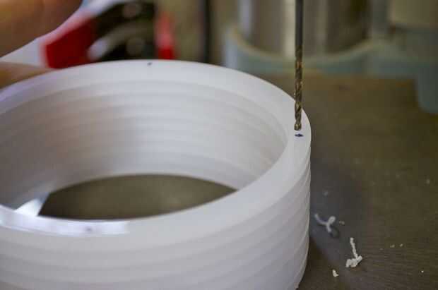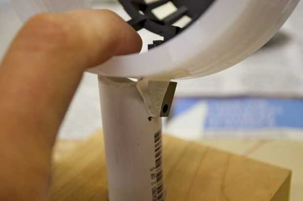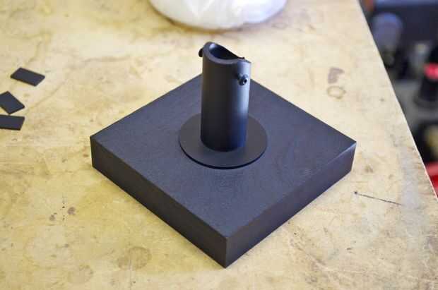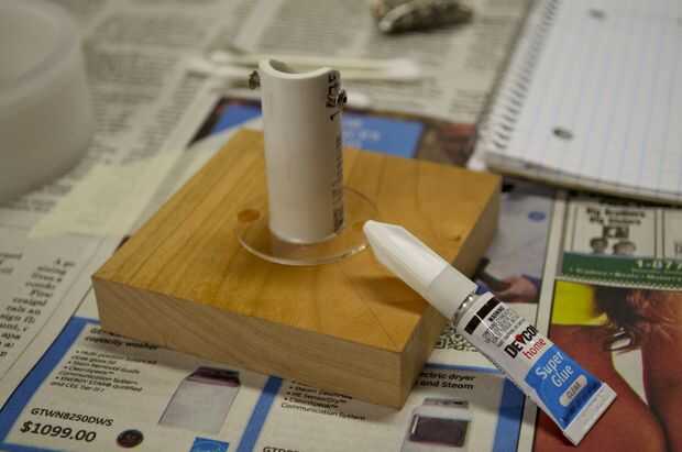 Hice la base de un pedazo grueso de 1 pulgada de madera. Me corte en un cuadrado de 3,5 pulgadas y varios agujeros en ella para colocar el enchufe y tubos perforados. Usé la tubería de PVC de 1/2 pulgadas para el tubo de soporte. No tengo una broca que era exactamente el tamaño correcto para el tubo, por lo que más perforó un poco, envuelve la parte inferior de la tubería en cinta cabe perfectamente, y luego láser corta un trozo que encajen firmemente alrededor del tubo y cubrieron la brecha.