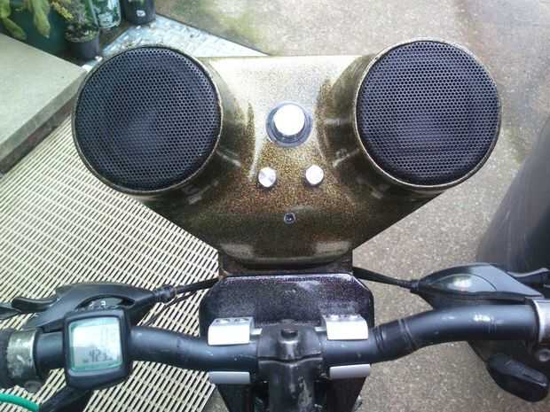 después de experiencias de muerte cercana unos usar auriculares y esquivando camiones, grabado algunos oradores viejo a mi vieja bicicleta... Desafortunadamente solo he descubierto 'instructables' y no cualquier acumulación de fotos, pero la construc